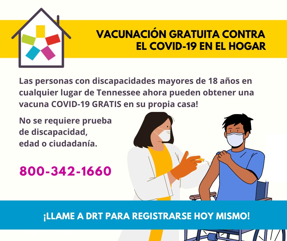 Las personas con discapacidades mayores de 18 años en cualquier lugar de Tennessee ahora pueden obtener una vacuna COVID-19 en su propia casa! No se requiere prueba de discapacidad, edad o ciudadanía.  Llame al 800-342-1600. Llame a DRT para registrarse hoy mismo.