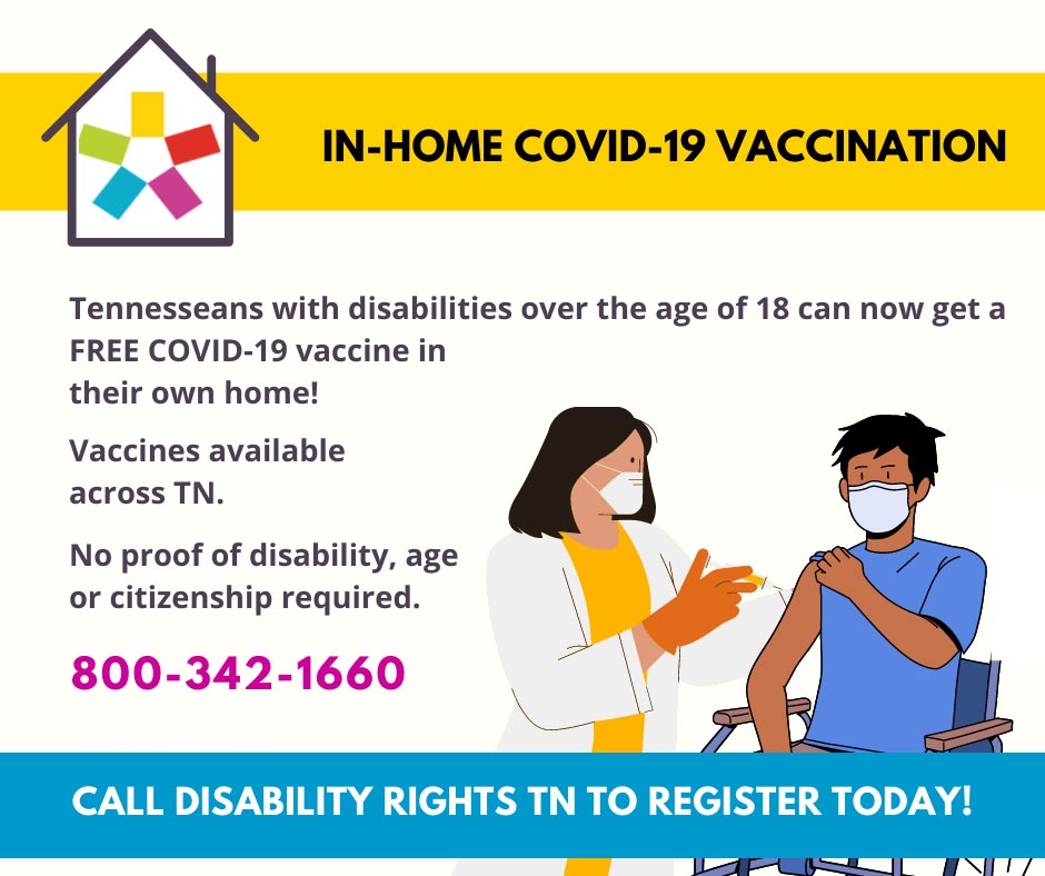 Tennesseans with disabilities over the age of 18 can now get a FREE COVID-19 vaccine in their home. Vaccines are available across Tennessee. No proof of disability, age, or citizenship is required.  Call 800-342-1600. Call Disability Rights TN to register today.