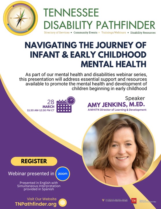 The second webinar of our mental health and disabilities webinar series, Navigating The Journey of Infant & Early Childhood Mental Health, will address essential support and resources available to promote the mental health and development of children beginning in early childhood. Join us with guest speaker Amy Jenkins, M.Ed., director of learning development, AIMHiTN.