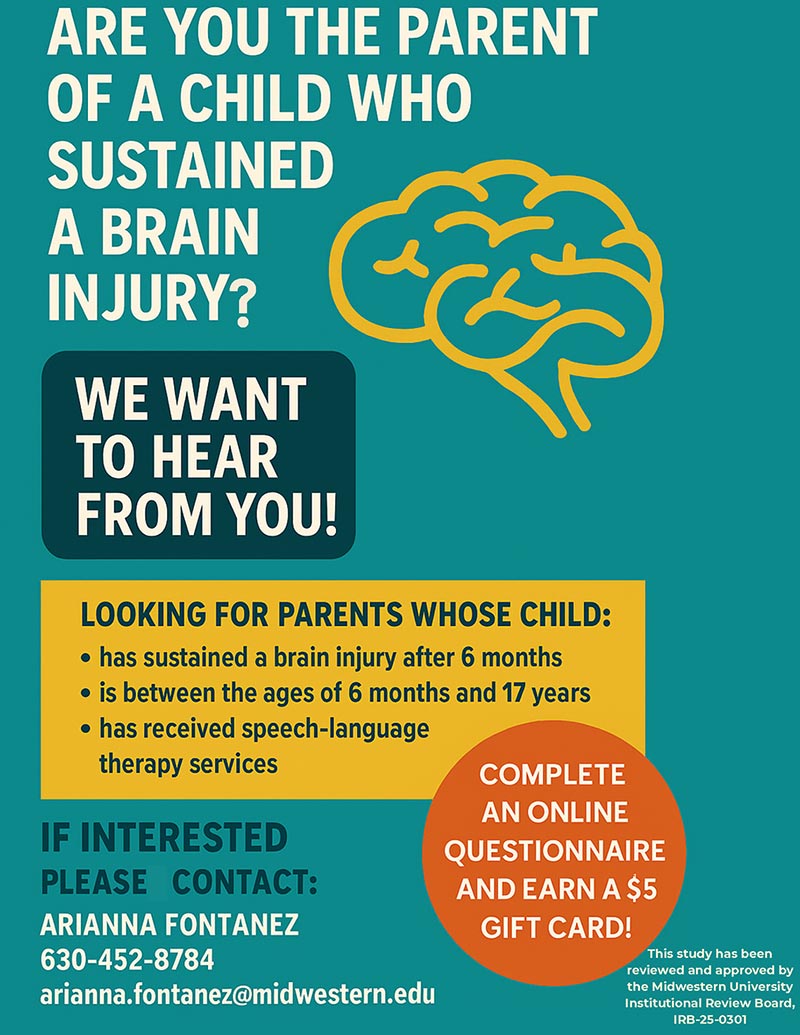 The Speech-Language Pathology Department at Midwestern University is conducting a research study to better understand parent perspectives on speech-language therapy services for children who have experienced a traumatic brain injury (TBI), including concussion.