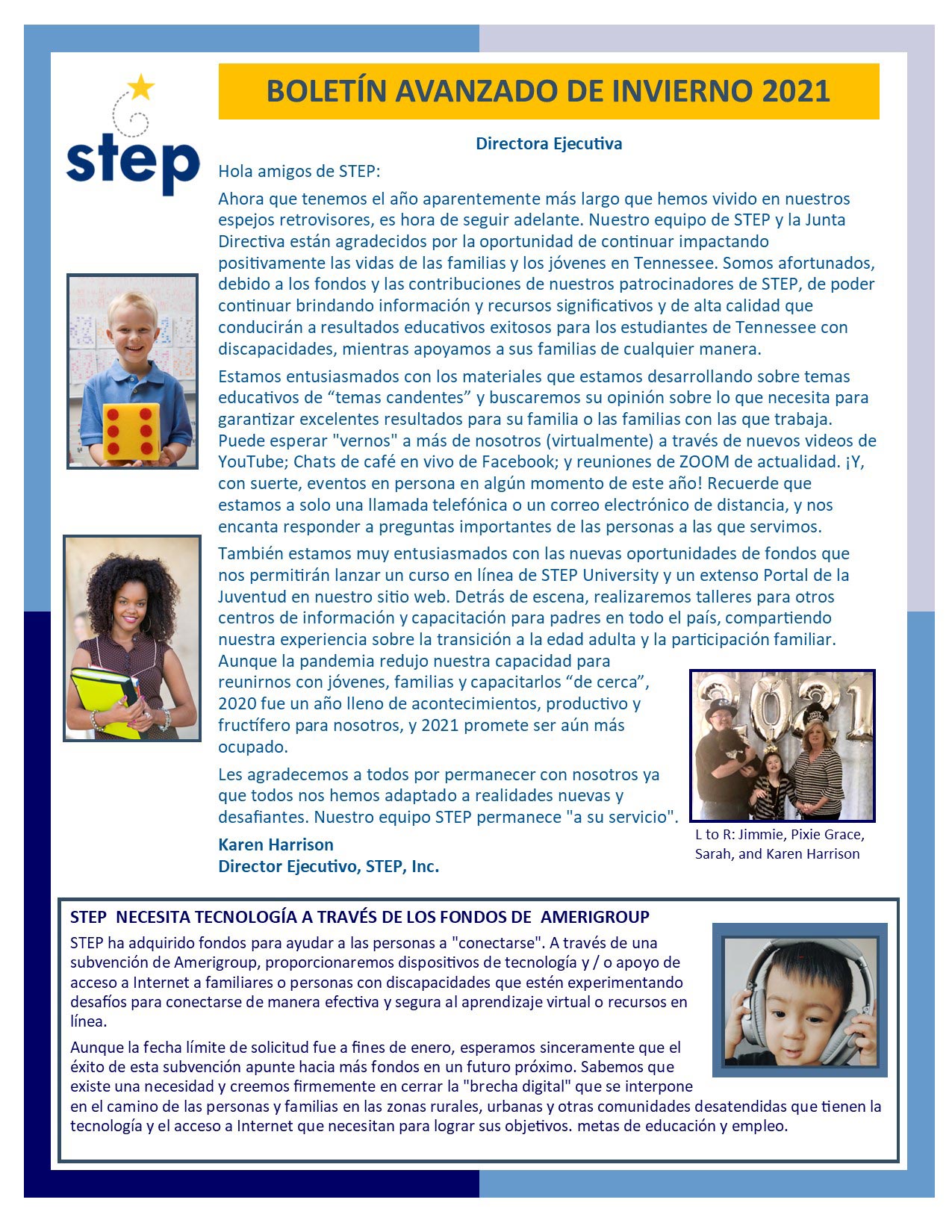 Ahora que tenemos el año aparentemente más largo que hemos vivido en nuestros espejos retrovisores, es hora de seguir adelante. Nuestro equipo de STEP y la Junta Directiva están agradecidos por la oportunidad de continuar impactando positivamente las vidas de las familias y los jóvenes en Tennessee. Somos afortunados, debido a los fondos y las contribuciones de nuestros patrocinadores de STEP, de poder continuar brindando información y recursos significativos y de alta calidad que conducirán a resultados educativos exitosos para los estudiantes de Tennessee con discapacidades, mientras apoyamos a sus familias de cualquier manera.