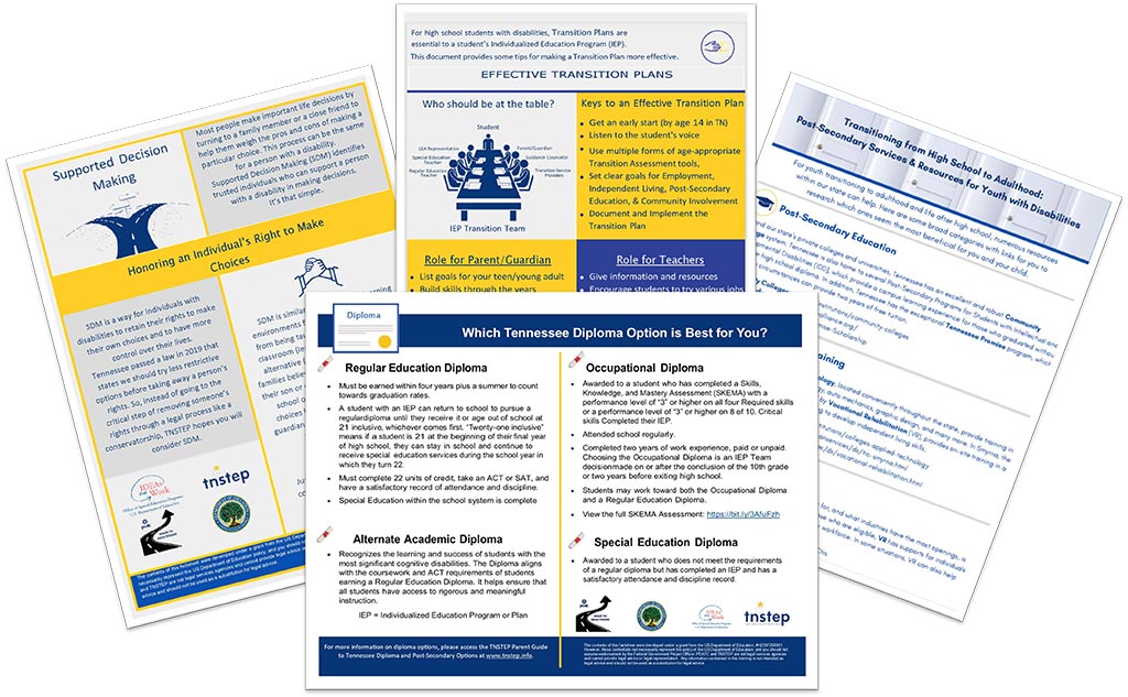 TNSTEP has rolled out four new easy-to-use Transition Guides. These one-page guides feature information on diploma options, supported decision-making, tips for making a transition plan more effective, and post-secondary services and resources for youth with disabilities. The guides were developed collaboratively with TNSTEP and PEATC (Virginias Parent Training and Information Center) under a Rehabilitation Service Administration (RSA) grant from the US Department of Education. This grant focuses on the transition of students with disabilities from high school to post-secondary education, employment, and independent living. PEATC, the Region B1 RSA Parent Center, collaborates with parent training centers and other disability organizations throughout the six-state region that includes Virginia, Florida, Georgia, North Carolina, South Carolina, and Tennessee.